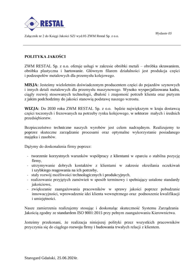 ZWM Restal Sp. Z.o.o with headquarters in Starogard Gdański is a production company with over 40 years of experience in the metal industry. The main pillar of our activity is the production of parts and components made of steel, non-ferrous metals and plastics, such as polyamide and textolite.